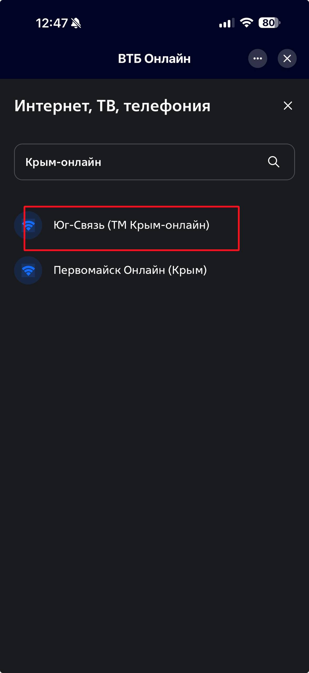 3. Выберите в списке провайдеров "Юг-Связь (ТМ Крым-онлайн)